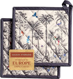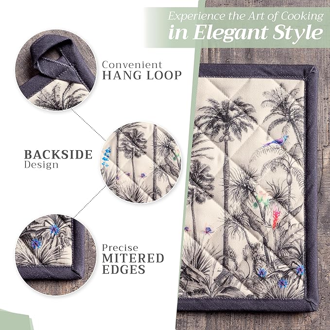 • Package includes: 2 pot holders measures 8"x8". Ideal as a hot pad for dishes, coffee pots, cast iron pans, or cookware. Designed in Europe and Made in India, it blends style, function, and comfort into a daily kitchen essential
