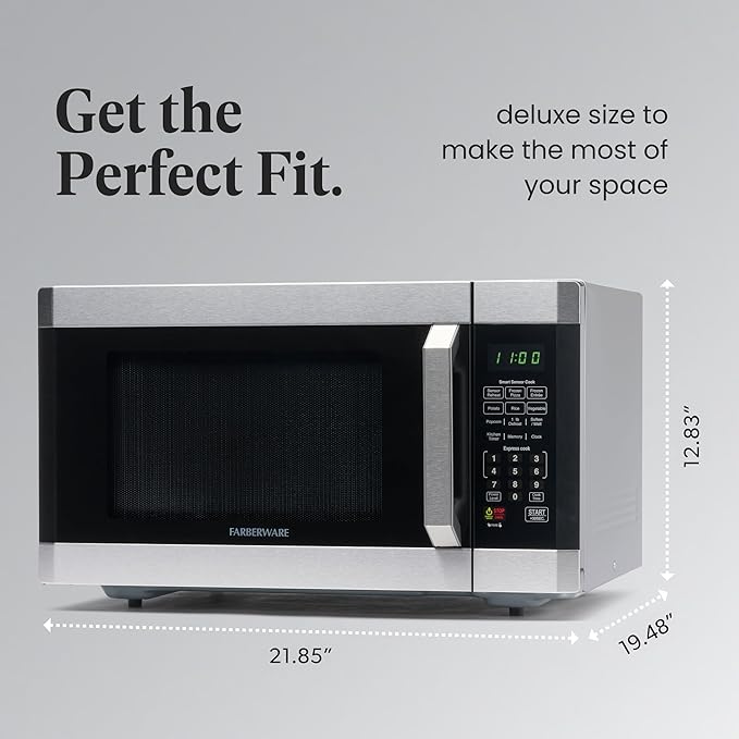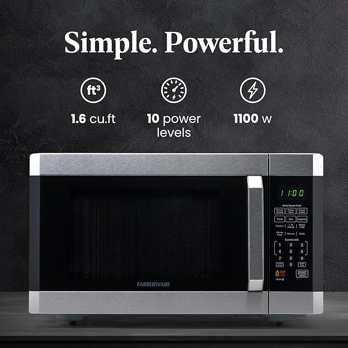 Farberware Countertop Microwave 1100 Watts, 1.6 cu ft - Smart Sensor Microwave Oven With LED Lighting and Child Lock - Perfect for Apartments and Dorms - Easy Clean - Stainless Steel