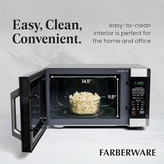 • ALL YOU NEED: This microwave has a clear LED display with a kitchen timer and clock that lets you easily keep track of time. Easy-to-view interior lighting lets you keep an eye on your dish, and a child safety lock adds additional security.