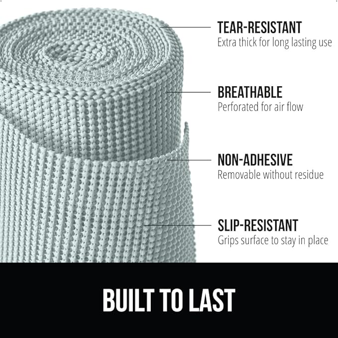 • EXTRA STRONG GRIP NON-ADHESIVE LINER: the Gorilla Grip powerGRIP liner is a non adhesive and tear resistant liner engineered with the highest quality materials to reduce slipping and bunching in your drawers or cabinet shelves; superior gripping technology keeps both the liner in place on surfaces