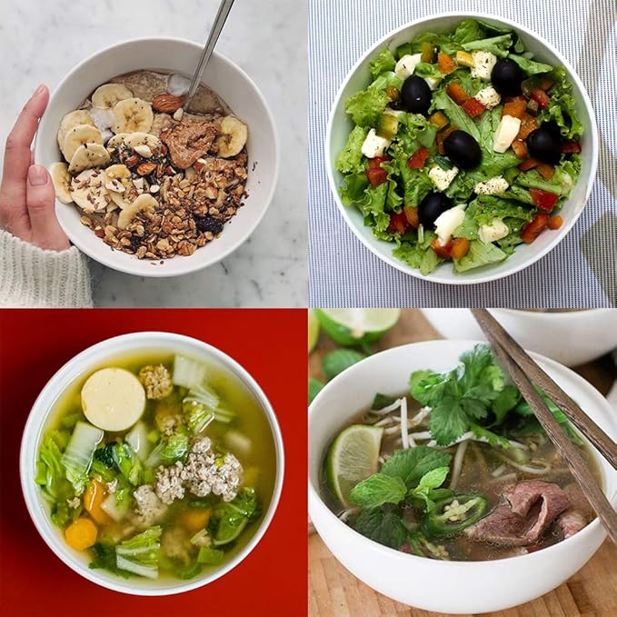 • Wide, Easy to Use - The bowl's diameter is 7 inches and 2.88 inches deep. The design of the bowl makes it easy to hold and food won't spill out. 32 ounces of normal capacity is perfect for cereal, salads, pasta, soup, and pho. Maximum 40 ounces.