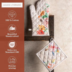 • Package includes: Set includes 1 oven mitt (7.5 x 13") and 1 pot holder (8 x 8"), perfect for baking, roasting, and cooking. Made from 100% cotton for reliable protection. Our products are Designed in Europe and Made in India