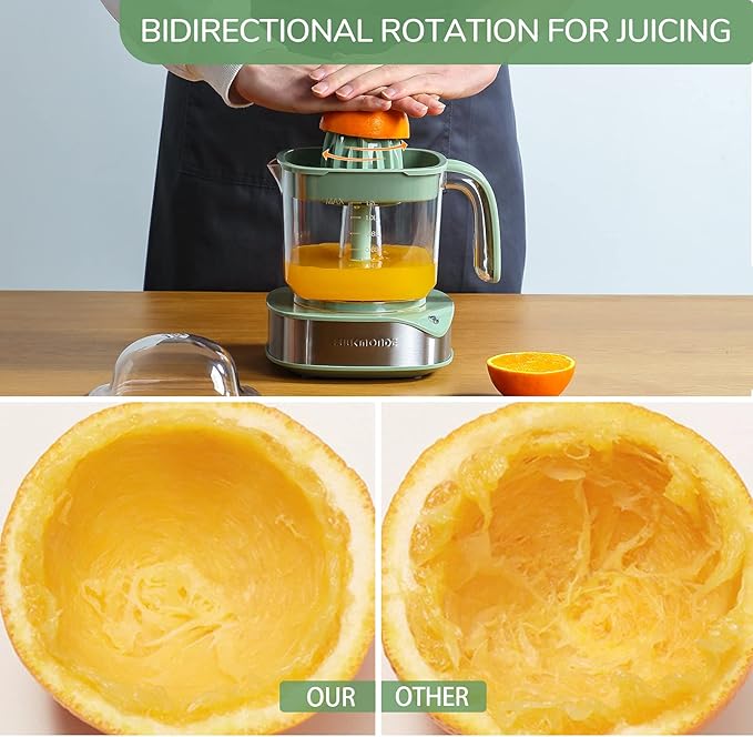 • SIMPLE IS BEST, ORIGIN IS BEST Simply press the orange, your juice is much more tasty! The electric orange juicer extract juice with slow speed, which don't heat up the juice and preserve the vitamins, enzymes and other nutrients. This electric squeezer provides the pure taste of the orange