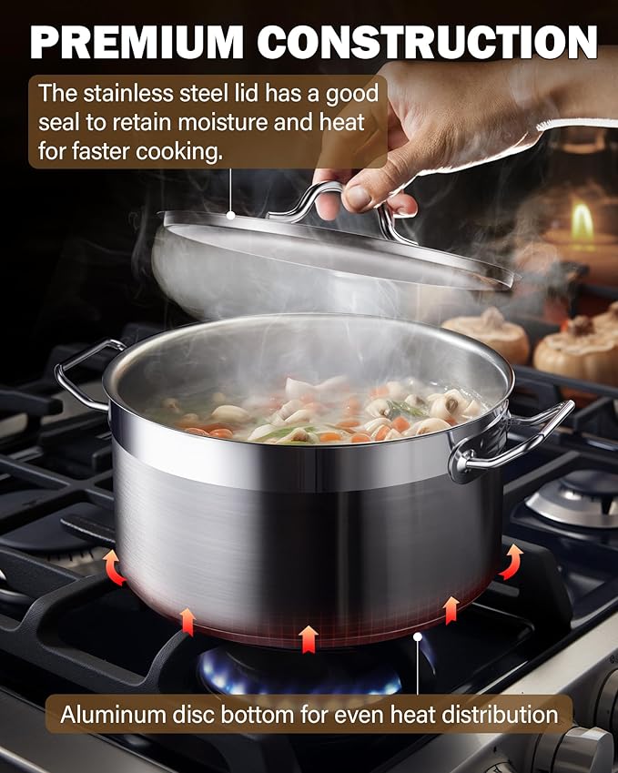 • Multi-Purpose: The stainless steel stockpot is versatile for various cooking methods, including stewing, boiling, frying, and more; It is easy to clean and fits well with a variety of kitchen styles