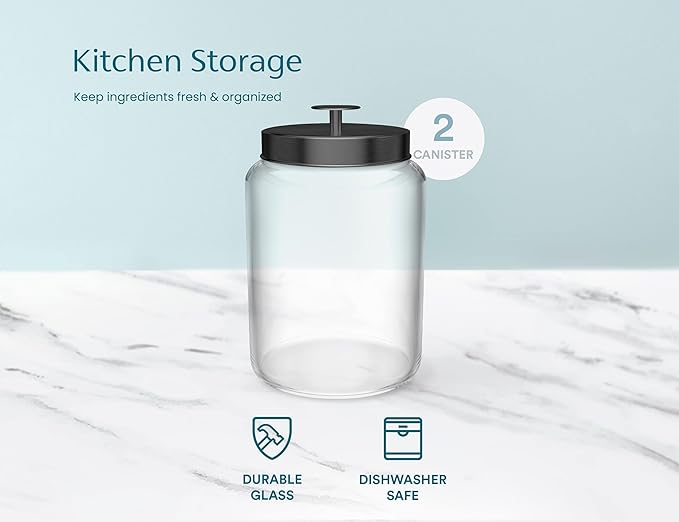 KooK Glass Storage Containers with Lids, Glass Jar with Lid, 1 Gallon, Set of 2, Glass Canister, Storage, Laundry, Kitchen Jar, (Circular, Black)