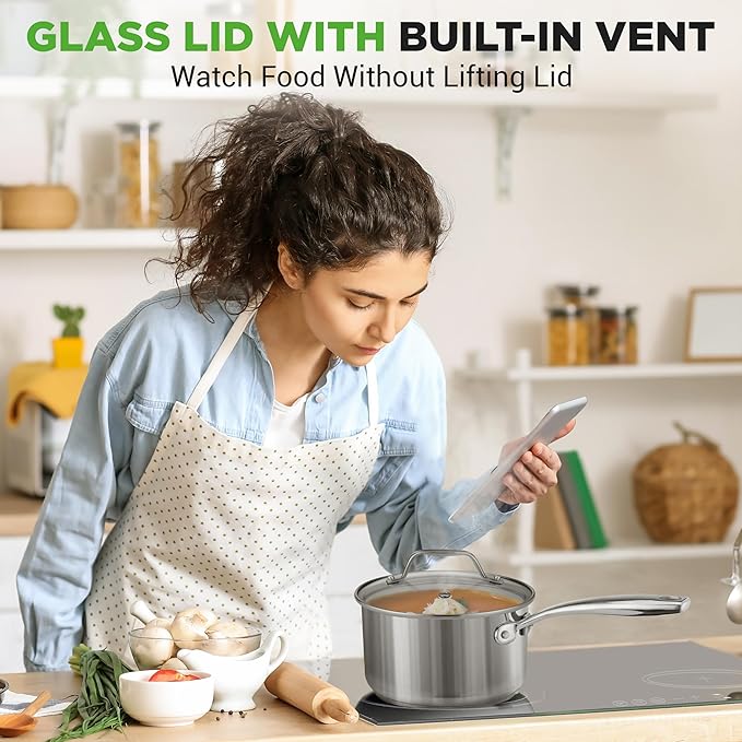 • SEE-THROUGH LID: This sauce pot for cooking is equipped w/ see-through tempered glass lid w/ vent hole that allows steam to escape. It effectively distributes & retains heat for even cooking w/ 500° F max temperature except glass lid