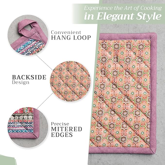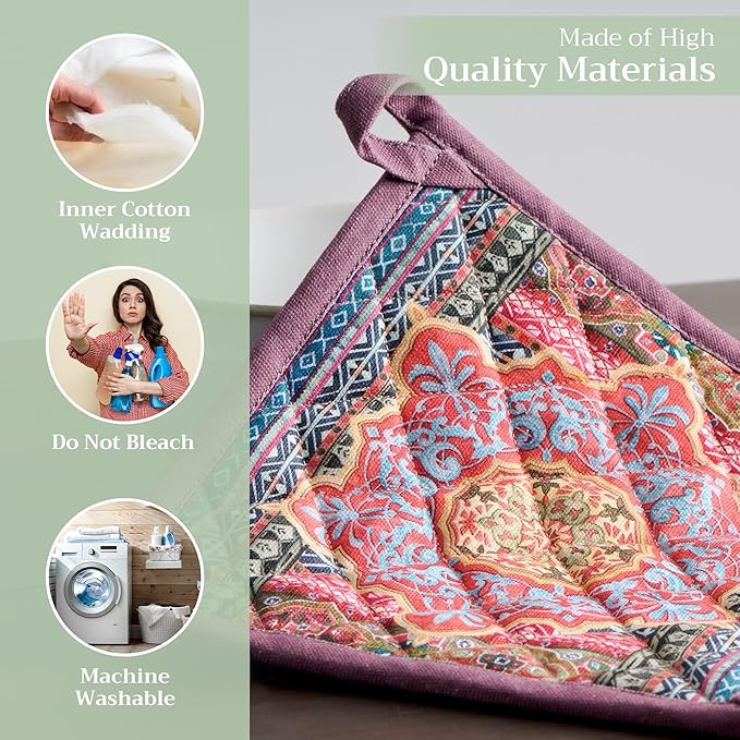 • 100% Quilted cotton: Made from premium quilted cotton, our pot holder ensures safe handling of hot pans or dishes. The soft, durable build provides excellent heat resistance and grip—perfect for everyday cooking and baking needs