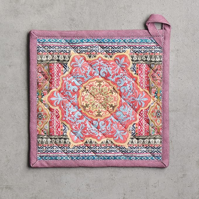 • Package includes: 1 pot holder measures 8"x8". Ideal as a hot pad for dishes, coffee pots, cast iron pans, or cookware. Designed in Europe and Made in India, it blends style, function, and comfort into a daily kitchen essential
