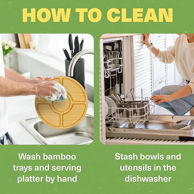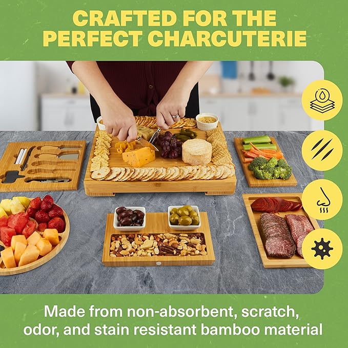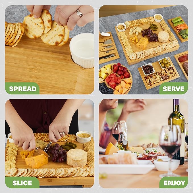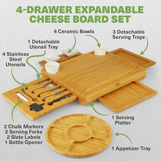 • Complete Set: Includes 4-drawer expandable cheese board with 4 stainless steel utensils, detachable tray, 4 ceramic bowls, 3 serving trays, platter, appetizer tray, markers, forks, labels, and opener