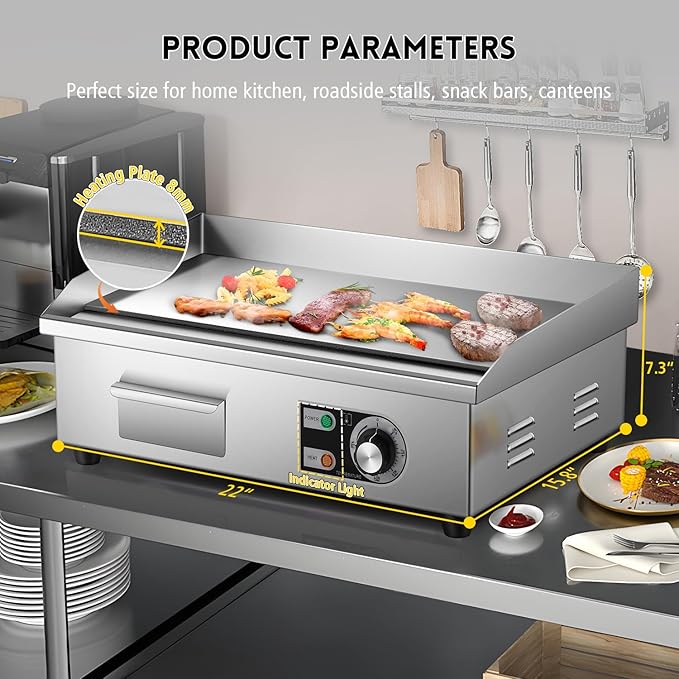 • Efficient & Uniform Heating - Commercial electric countertop griddle is made of premium Stainless Steel, cook tasty food on the large cooking area. Thickened heating plate is 8mm(0.3’’), more sturdy and durable, provide efficient and uniform heating.