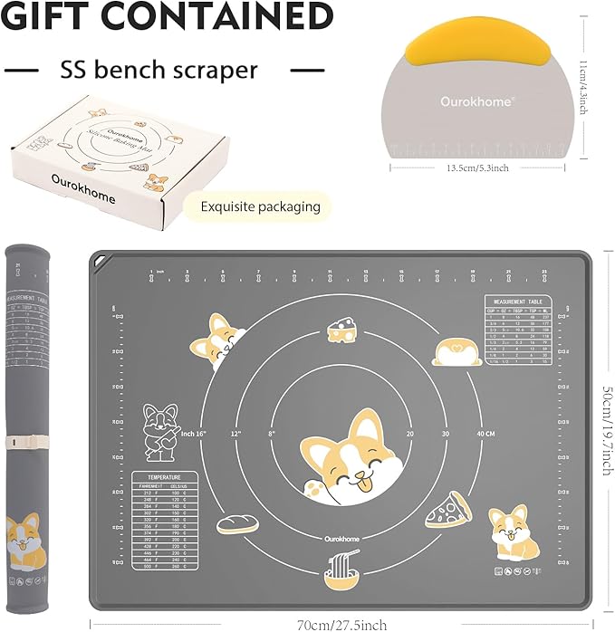 • Your go-to solution for hassle-free baking: Made from high-quality food-grade soft platinum silicone. Save your countertop from getting messy. Say goodbye to floor all over the flour. Included a bench scraper with scale and conversion table