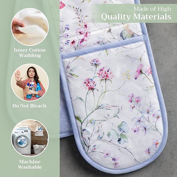 Maison d' Hermine Double Oven Mitts 100% Cotton 7"x35" Double Oven Mitt Heat Resistant BBQ Cooking Gloves with Loop, Baking, Grilling, Home, Kitchen, Handling Hot Pans Spring Summer (Summer Floral)