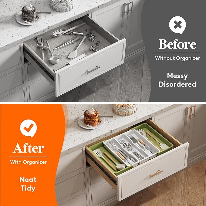 • Safe to Use: Crafted from BPA-free PP material, this cutlery drawer organizer guarantees the safety of all your utensils, silverware, and flatware. Cleaning is a breeze as well - simply rinse with water to remove stains.