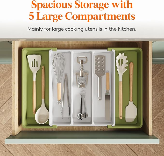 Lifewit Utensil Organizer for Kitchen Drawers, Expandable Cooking Utensil Tray, Adjustable Cutlery Silverware Flatware Holder, Plastic Spatula Tools and Gadgets Storage Divider, Large, Green&White