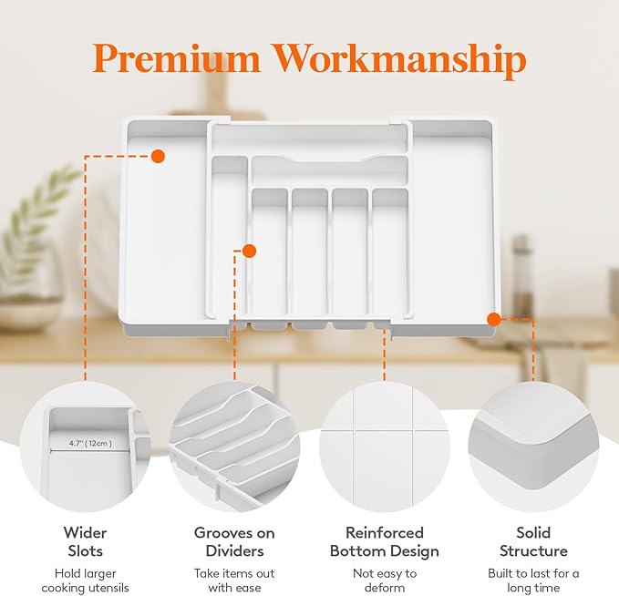 • Premium Construction: The utensil organizer for kitchen drawers is made of BPA-free PP material, ensuring its safety with all types of utensils, silverware and flatware. It has a solid bottom panel with sturdy dividers, keeping your silverware in place.