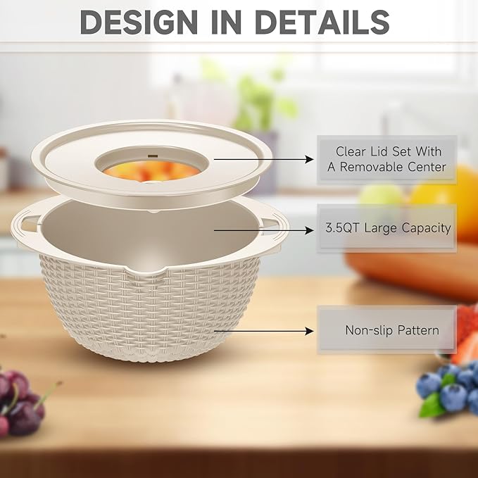 4-1 Colander with Bowl Set - Rotatable Colander Bowl with Measuring Spoons - Fruit Strainer Bowl, Food Strainers and Colanders Funny Presents for Women, Aesthetic Kitchen Gadget Essentials - Beige