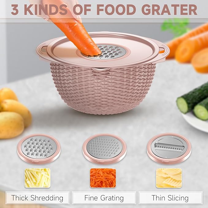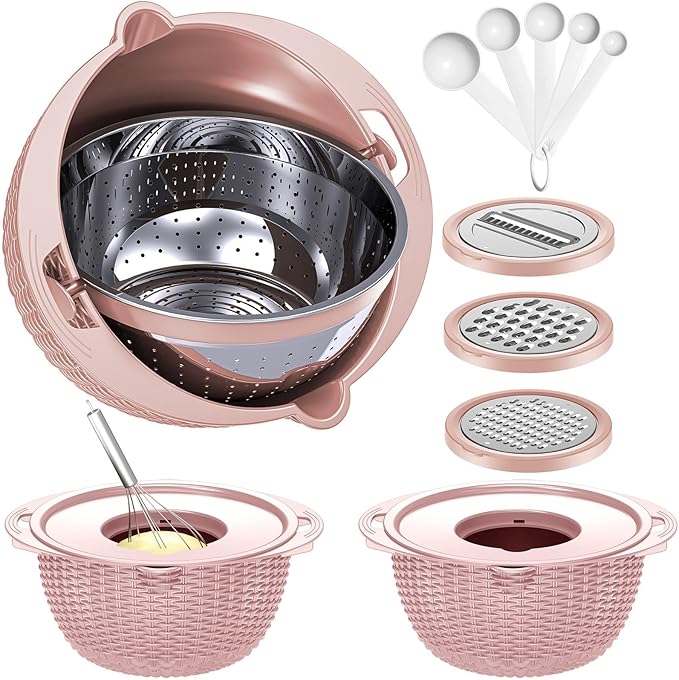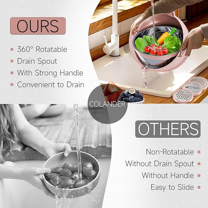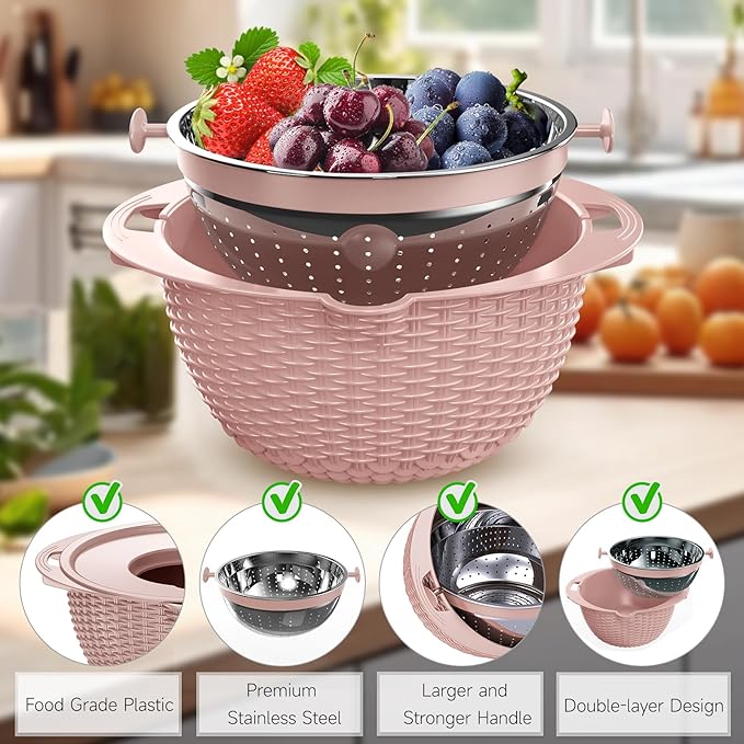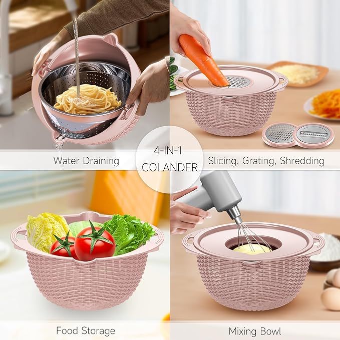 4-1 Colander with Bowl Set - Food Strainer with Graters & Spoons - Colanders for kitchen - Strainers and Colanders - Strainer Bowl Fruit Cleaner with Colander Pasta Rice Strainer for Veggie Wash Pink