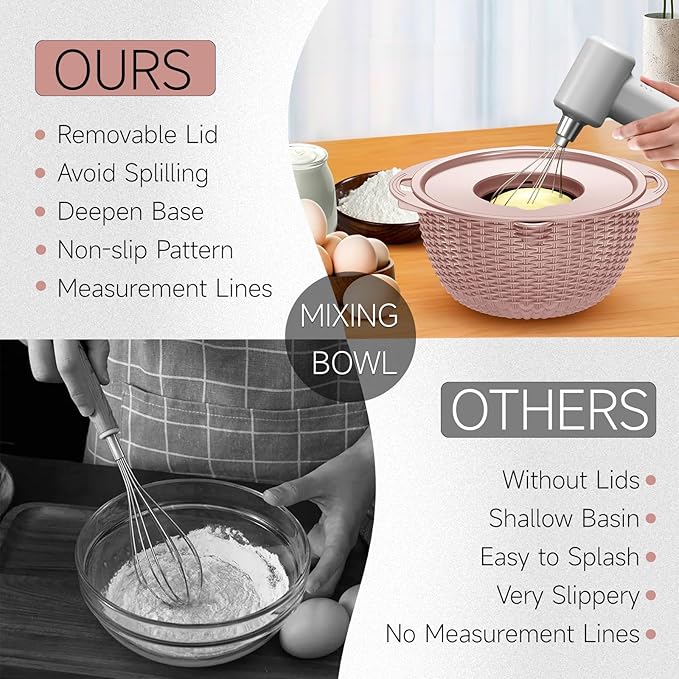 • Ergonomics in Details - The handle of the white colander set is large, sturdy, and easy to grip. The non-slip base and unique shape keep the bowl steady when beating on the counter or carrying it on the go. The density and right size of holes make draining fast and food won't fall. The open mouth on the pasta strainer makes water pouring fast.