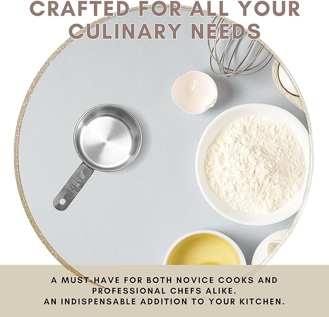 • Durable Stainless Steel - Built from premium, extra-thick food-grade stainless steel, this 1/2 cup measuring cup is made to endure daily use in busy kitchens without bending, breaking, or wearing down. It resists rust, corrosion, warping, and dents—even when scooping dense or sticky ingredients like brown sugar, peanut butter, or thick batters. The seamless one-piece construction ensures lasting performance and reliability. Great for cooking, baking, meal prep, or portioning dry dog food.