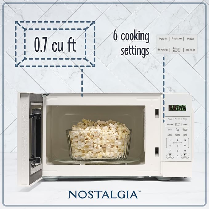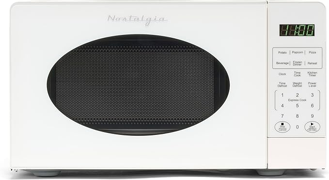 Nostalgia Modern Retro Countertop Microwave Oven - 700-Watt - 0.7 cu ft - 12 Pre-Programmed Cooking Settings - Digital Clock - Kitchen Appliances - White