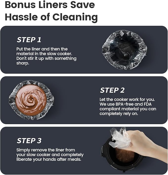 • [6 FREE SLOW COOKER LINERS] Easy to clean mini slow cooker,With the inclusion of KOOC slow cooker liners, cooking becomes even more effortless. You can enjoy the convenience of easy cleanup while still benefiting from the slow cooker's versatility in preparing a wide range of delicious meals