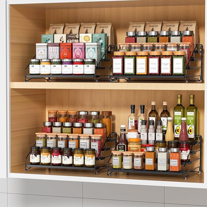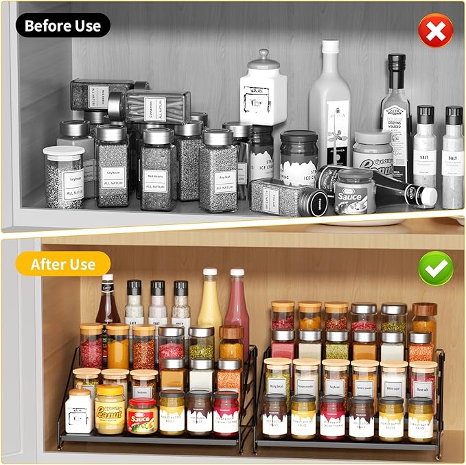 • 【Durable Metal,Strong And Sturdy】:The seasoning organizer rack made of high quality metal,sturdy frame and each tier has a sheet metal base design, provides spice bottles more stable to place and less to tip over. The surface of this cabinet organizer is smooth,with an anti-rust coating, and easy to clean with water or rag.