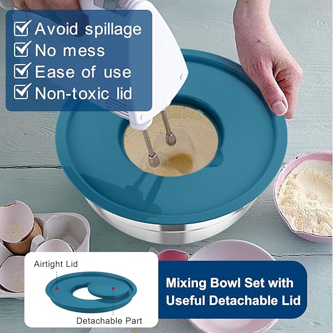 • Stackable & Kitchen Essential - The nesting bowls can be stacked together one by one and store in the largest bowl (5 in 1 bowl), Space saving and easy to store in the kitchen cabinet, Keep your kitchen neat and tidy, Color covers provide attractive look and complement to kitchen décor, A great choice for your friends and families at various holidays