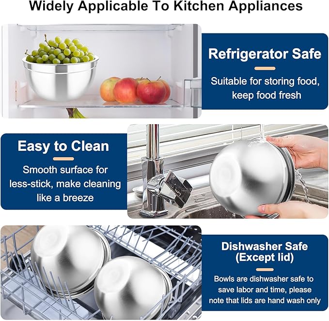 • Easy Clean & Dishwasher Safe - Bright mirror interior surface for easy food release and anti-fingerprint matte exterior for good stain protection, Easy to clean and looks like getting a new one after washing, The metal bowls are dishwasher safe to save labor, The plastic lids can only be washed by hand to avoid deforming