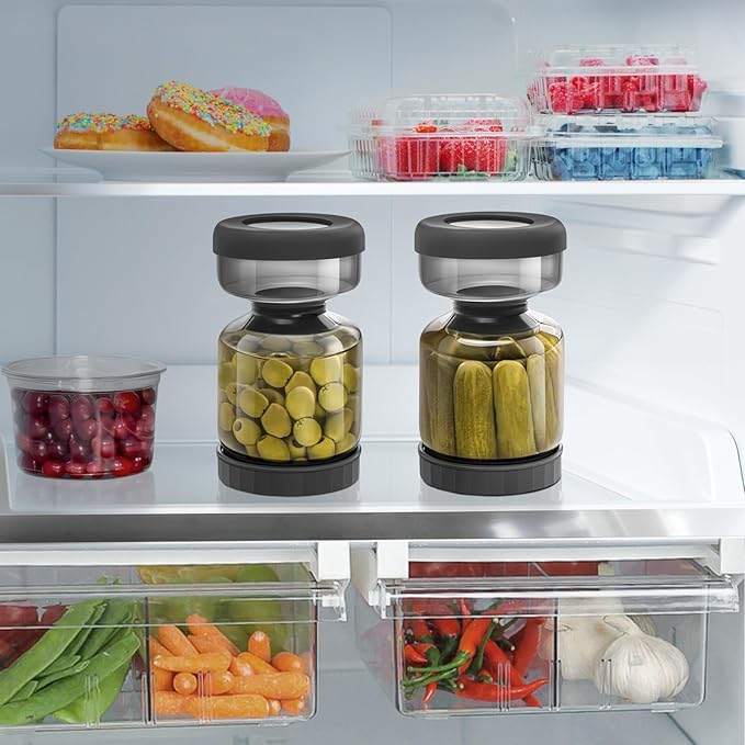 • 【Double Leak-proof Upgrade&Non-slip】Upgraded pickle jar features a double leak-proof design.Threaded design on the inside of the lid,coupled with a silicone sealing ring,ensures an airtight seal,keep pickles fresh and flavorful for longer.Ensuring the lid is tightly seated&silicone seal is correctly fitted before flipping means no leak.Better sealing keeps fridge clean at all times.Bottom with a non-slip silicone case,anti-drop and anti-skid can be used with confidence in refridge or cupboard.