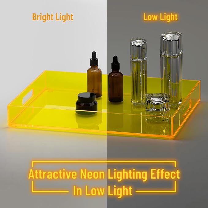 16"x12" Large Acrylic Serving Tray Decorative Ottoman Coffee Table Vanity Tray Tea Fruit Platter Snack Appetizer Dessert Drink with Handles for Bar Kitchen Party, Neon Yellow