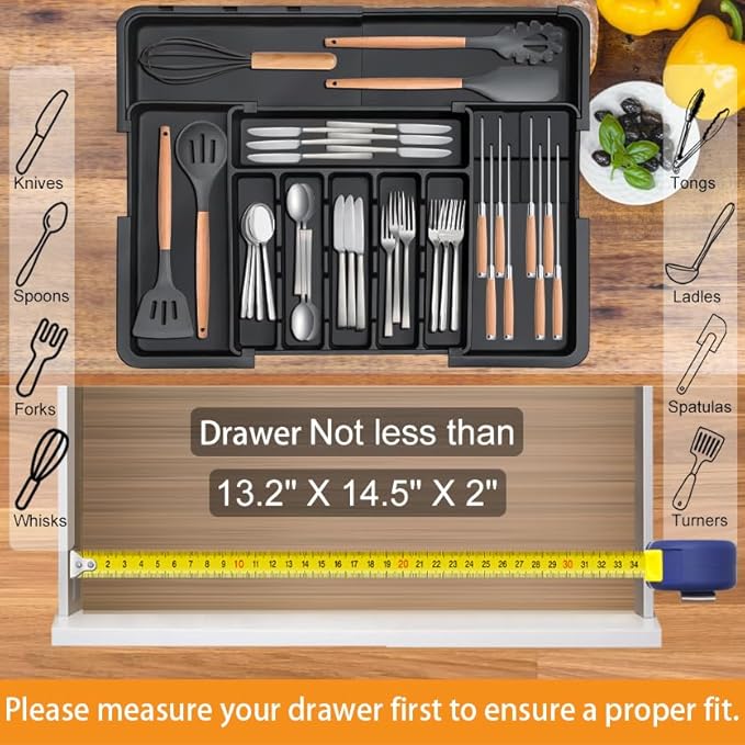• Adjustable Length and Width: Exclusive Patented Adjustable System – Unlike conventional silverware drawer organizers, our top-expandable silverware organizer features both ways adjustment from 13.2" to 22" in width (W) and 14.5" to 19" in depth (D), height is 2", with modular dividers for precision drawer storage. Please note that your drawers interior measure at least 13.2"W x 14.5"D x 2"H” (Pls measure drawer size before ordering)