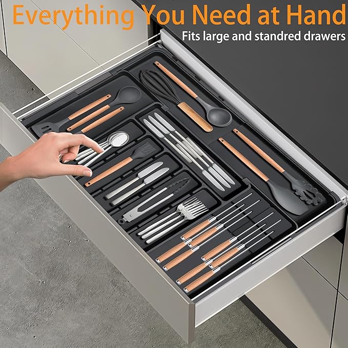 • Considerate Design: Worried about your utensil tray sliding around in the drawer? Fear not! Our kitchen organizers and storage features anti-slip bases on all four corners, keeping items securely in place and preventing unnecessary movement. The buckle design facilitates smooth sliding and effortless adjustment