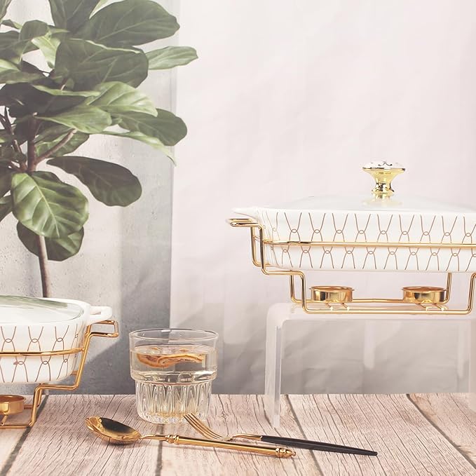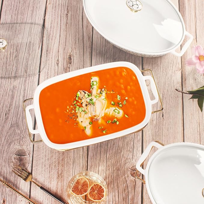 • Enjoy Delicious Food: The tray features a gold-plated metal base with holders for tea-light candles, (When heating candles, please do not dry burn them, There should be water or soup in the casserole, and the soup should not be too thick to avoid burning the pan and causing it to burst). Classic white soup tureen blends with every style of table and home decor.