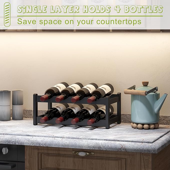 BMOSU Bamboo Wine Rack Wine Storage Cabinet Shelf 8 Bottle Wine Racks Countertop Sturdy for Kitchen Dining Room Pantry - 2 Tiers Wine Rack (Black)