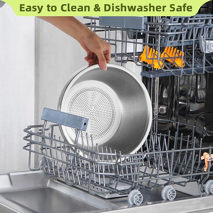 • SUITABLE KITCHEN DIMENSION: Holds 2 quart items. The combination of the stainless steel strainer and mixing bowl makes it easy to clean and prepare food, becoming an indispensable tool in your kitchen