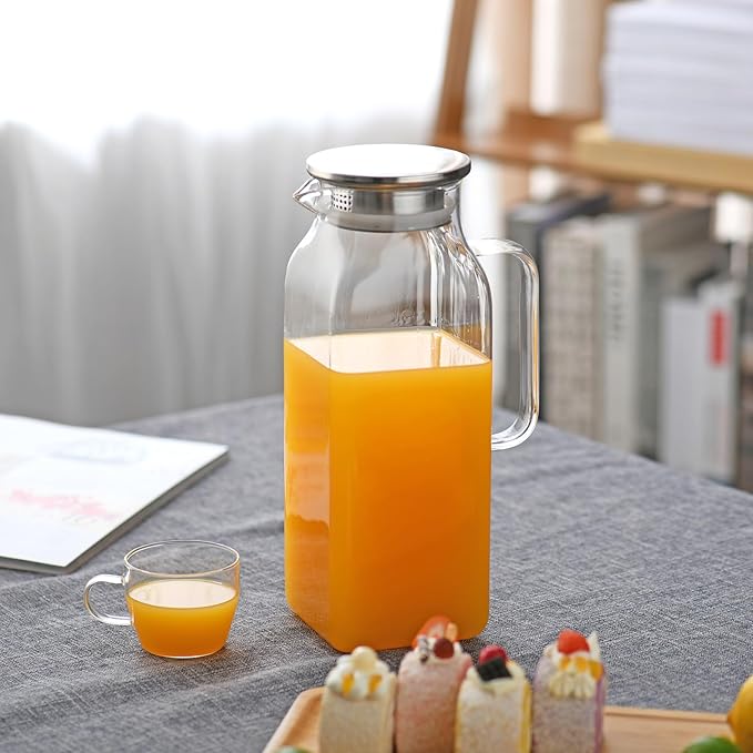 • 2. Designed For Homemade Beverages: This glass pitcher comes with a dual opening stainless steel lid, which can be adjusted as you like, making it easy to retain pulp and ice cubes or pour beverages quickly. The drip-proof spout and ergonomic handle make pouring a breeze, and the food-grade silicone around the lid fits snugly against the body of the jug to avoid wetting the countertop.