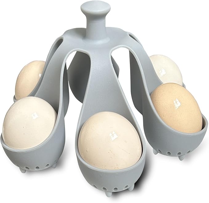 • BEST DESIGN:The many holes underneath the egg cooker allow for even heat while cooking and quick draining and drying when removing. And the bottom of each egg holder is supported by 4 posts to keep the eggs standing in boiling water without worrying about them breaking, the long handles stay cool so you can quickly and safely add or remove eggs from boiling water, made of food-safe and durable silicone that is BPA-free. dishwasher safe