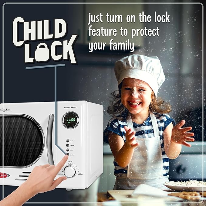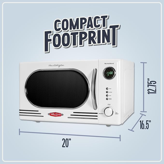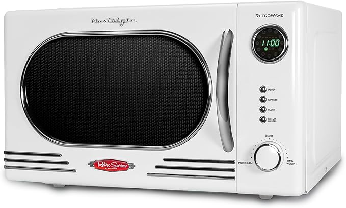 • VINTAGE ACCENTS: Add retro and classic charm to your kitchen with this microwave's sleek chrome door handle, control panel, and accents.