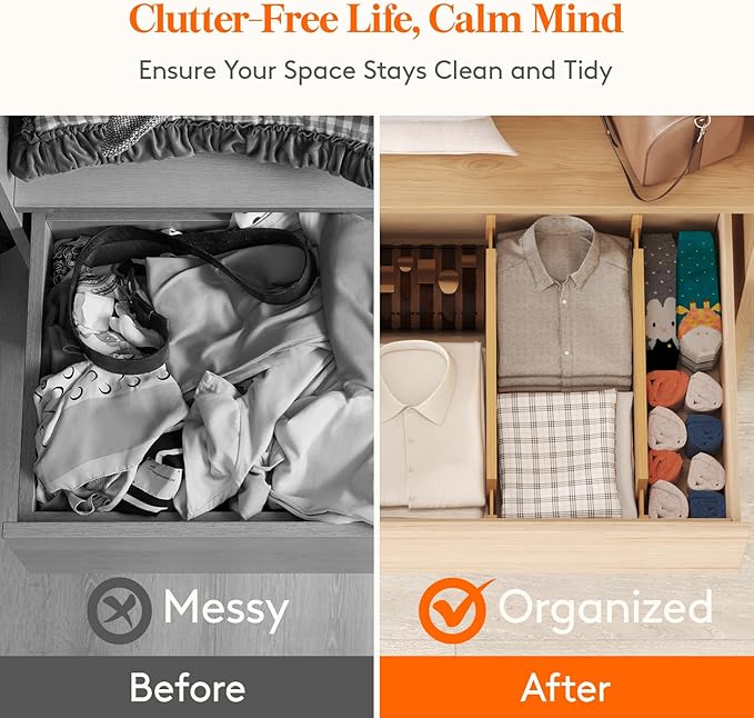• Safe and Secure: Crafted with a high-quality and moderate-tension spring, our dresser drawer organizer won’t damage your drawer; It features scratch-proof pads on the ends to ensure your drawers stay free from trace or residue