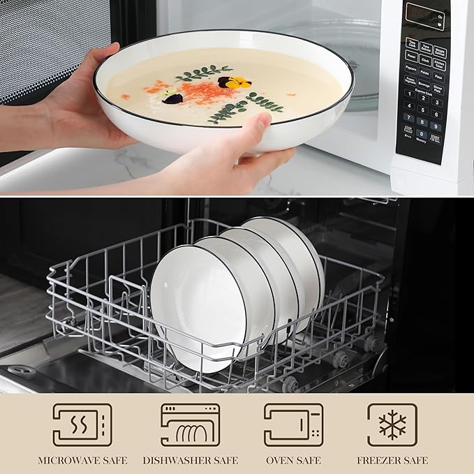 • 【WIDE & SHALLOW DESIGN】White Pasta Bowls featuring a wide and shallow design prevents spills and messes. Featuring a modern and minimalist design with a classic white finish and smooth glaze, these bowls complement any table setting and enhance dining experience.