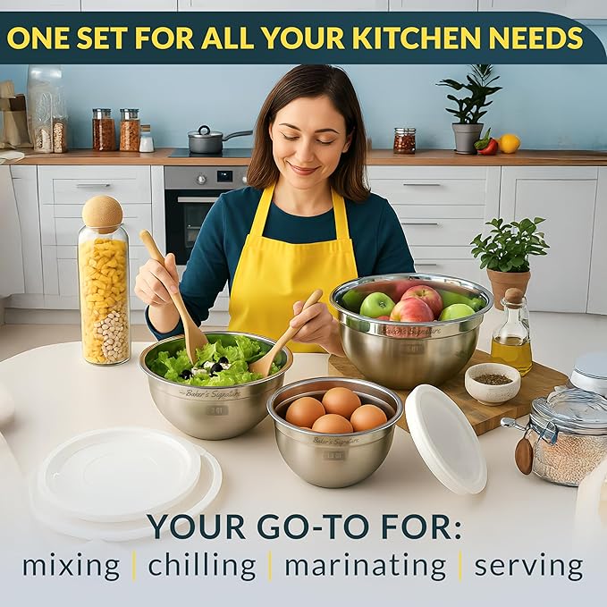 Baker's Signature Stainless Steel Mixing Bowls With Lid, Metal Mixing Bowl Set Of 3, Nesting Set For Food Prep, Baking,Storage, Cooking, Serving | Dishwasher Safe, Silver, 1.5/3/5 Qt