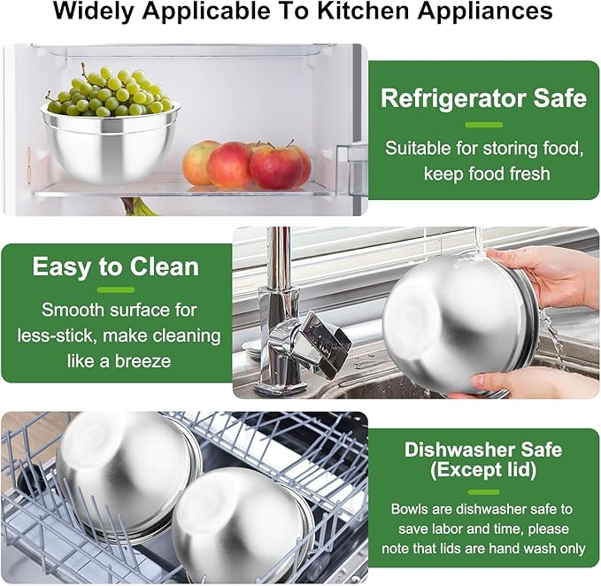 • Easy Clean & Dishwasher Safe - Bright mirror interior surface for easy food release and anti-fingerprint matte exterior for good stain protection, Easy to clean and looks like getting a new one after washing, The metal bowls are dishwasher safe to save labor, The plastic lids can only be washed by hand to avoid deforming