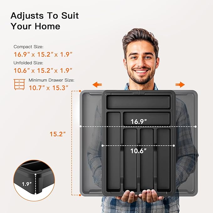 • Adjusts To Suit Your Space: Featuring a clever expandable design, this drawer organizer fits a variety of drawer sizes and shapes. It measures 10.6" in width when folded, expanding up to 16.9" when fully extended, with a length of 15.1" and a height of 1.9" – a utensil drawer organizer versatile enough for almost all your storage needs.