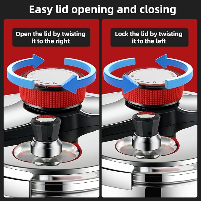 • ✅[Unique easy-to-lock lid system]-This pressure cooker uses an innovative design for one-handed lid opening and closing, and the lid can be locked or opened in any position by turning the knob with one hand. If the pressure inside the pot increases, the lid cannot be unlocked.