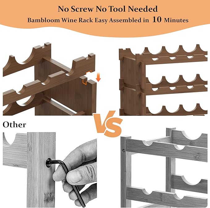 • 【Large Capacity Wine Rack】 Bambloom wine rack meets all the needs of your home wine bottles storage make your 'wine area' more tidy and wine collection accessible without taking a lot of space. Each wine rack tier can store 9 bottles of wine, 4-Tiers compact design allows it to hold 36 wine bottles. It is highly versatile and makes an excellent gift for wine enthusiasts and collectors. Please note, wine is not included.