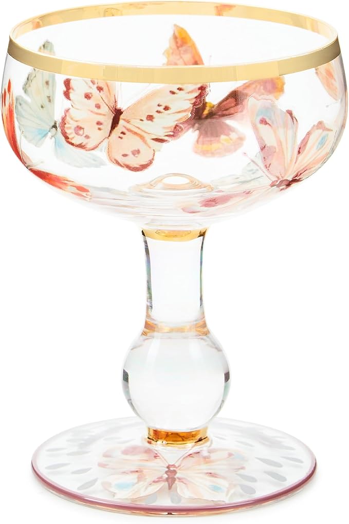 • FANCY GLASSWARE: The Butterfly Hill Coupe Glass is sure to become a staple for your home cocktail bar. It features hand-applied butterfly transfers on a hand-painted base and is trimmed with gold luster.