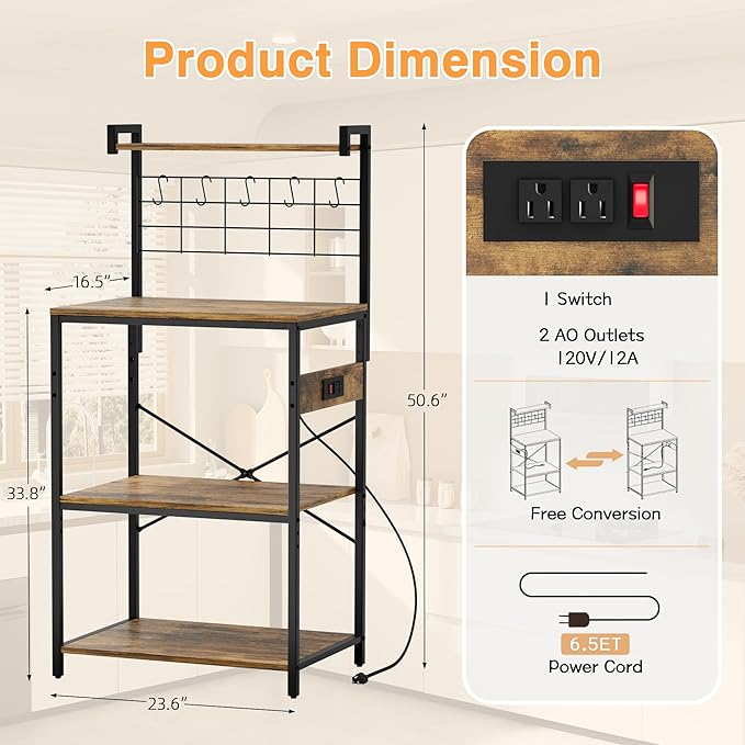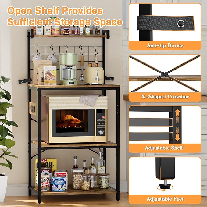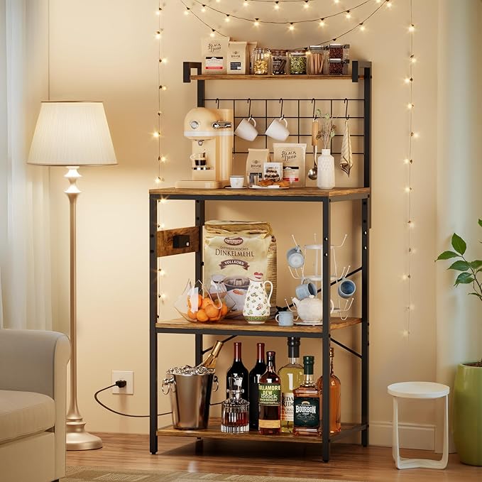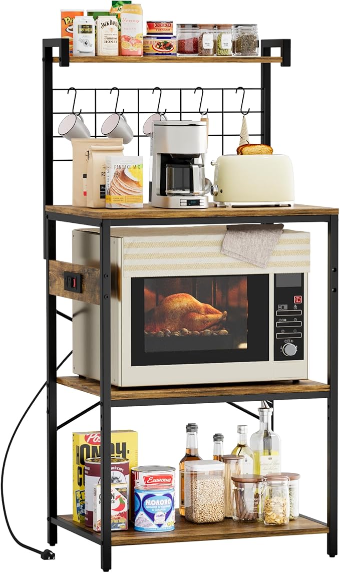 YESHOMY Kitchen Baker’s Rack with Power Outlet, 4-Tier Microwave Stand, Coffee Bar with 5 S-Shaped Hooks, Heavy Duty Storage Shelf Unit for Spices, Pots, Rustic Brown