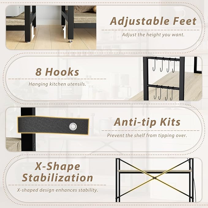 • Multiple Storage Solution: a multi-functional baking rack with ample shelves and S-shaped hooks, perfect for organizing kitchen utensils, small appliances and decorative objects in a well-organized manner.