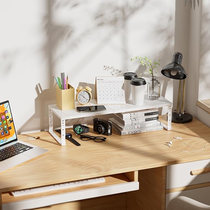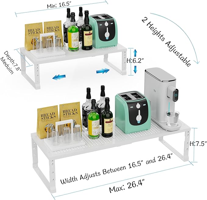 • ✅【Adjustable & Expandable Cabinet Shelf Organizer】 Customize your kitchen storage with our expandable metal shelving unit! Easily adjust the length from 16.5" to 26.4" to fit cabinets, countertops, or pantry spaces (dimensions: 16.5~26.4"W x 7.8"D x 6.2~7.5"H). Stack multiple units vertically to create a tiered storage solution for maximum space efficiency—perfect for plates, bowls, mugs, or canned goods.