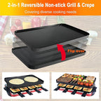 • Classic 2-in-1 Grill Plate: Experience versatile cooking with our reversible die-cast aluminum grill plate. Sear perfect grill marks & drain excess oil on the grooved side, or cook delicate items like eggs, pancakes and crepes on the smooth flat side. One electric raclette grill replaces multiple appliances, saving space and time.